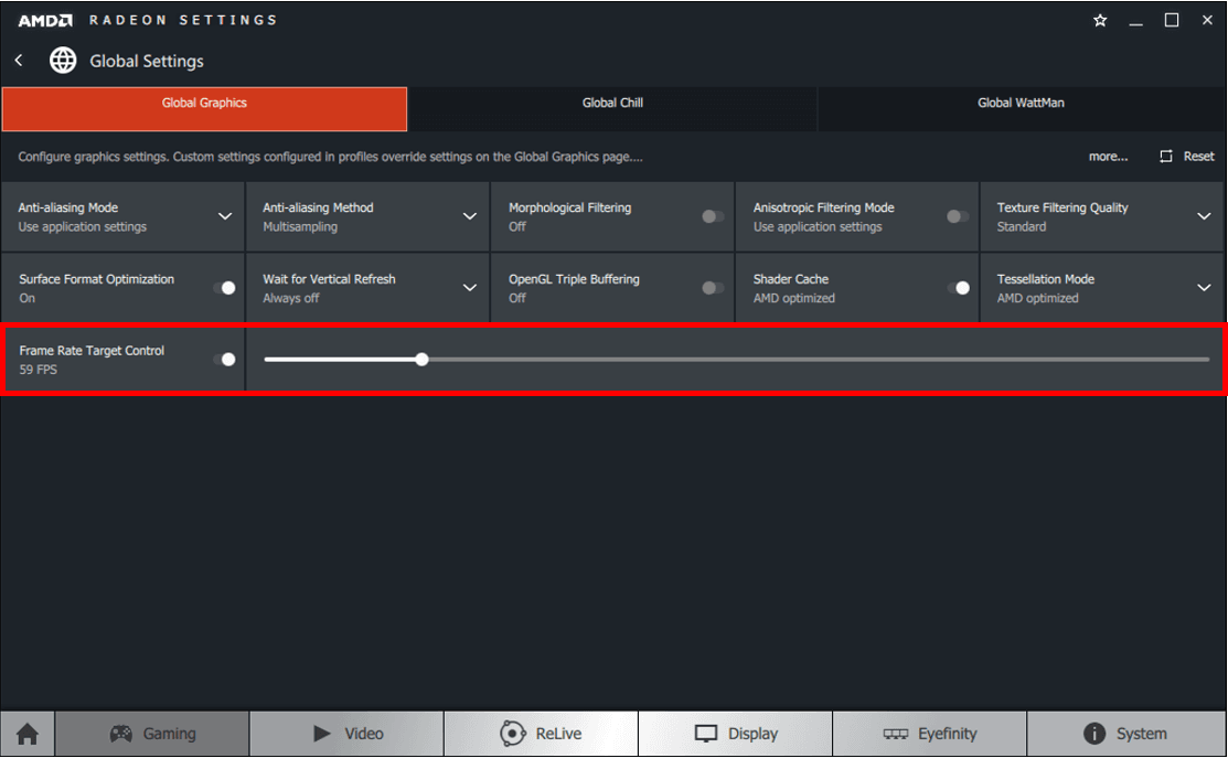Par exemple, si dans un jeu tu ne fais que te promener et qu’il n’y a pas beaucoup d’action en cours, Radeon Chill peut faire baisser ton FPS au plus près de la valeur minimale pour économiser de l’énergie, et si l’activité ou l’action en cours dans le jeu augmente, alors il permet au FPS d’atteindre la valeur maximale pour augmenter les performances. Radeon Chill est une excellente fonction, surtout pour les ordinateurs portables où tu veux obtenir une autonomie maximale de ta batterie. Il n’est pas recommandé d’utiliser Radeon Chill avec FRCTC car ils peuvent se contredire et entraîner de graves problèmes dans les jeux. Cependant, Radeon Chill peut être utilisé avec FreeSync pour éliminer le déchirement de l’écran et éventuellement le bégaiement.